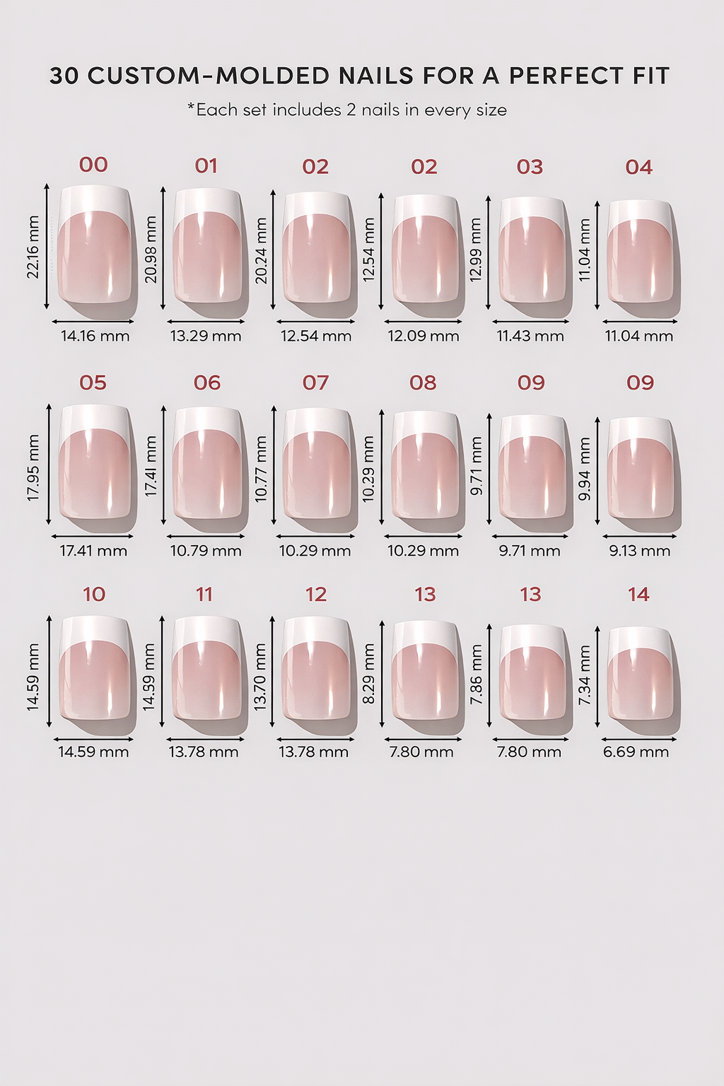 Each set includes multiple sizes to ensure the perfect fit for every nail.